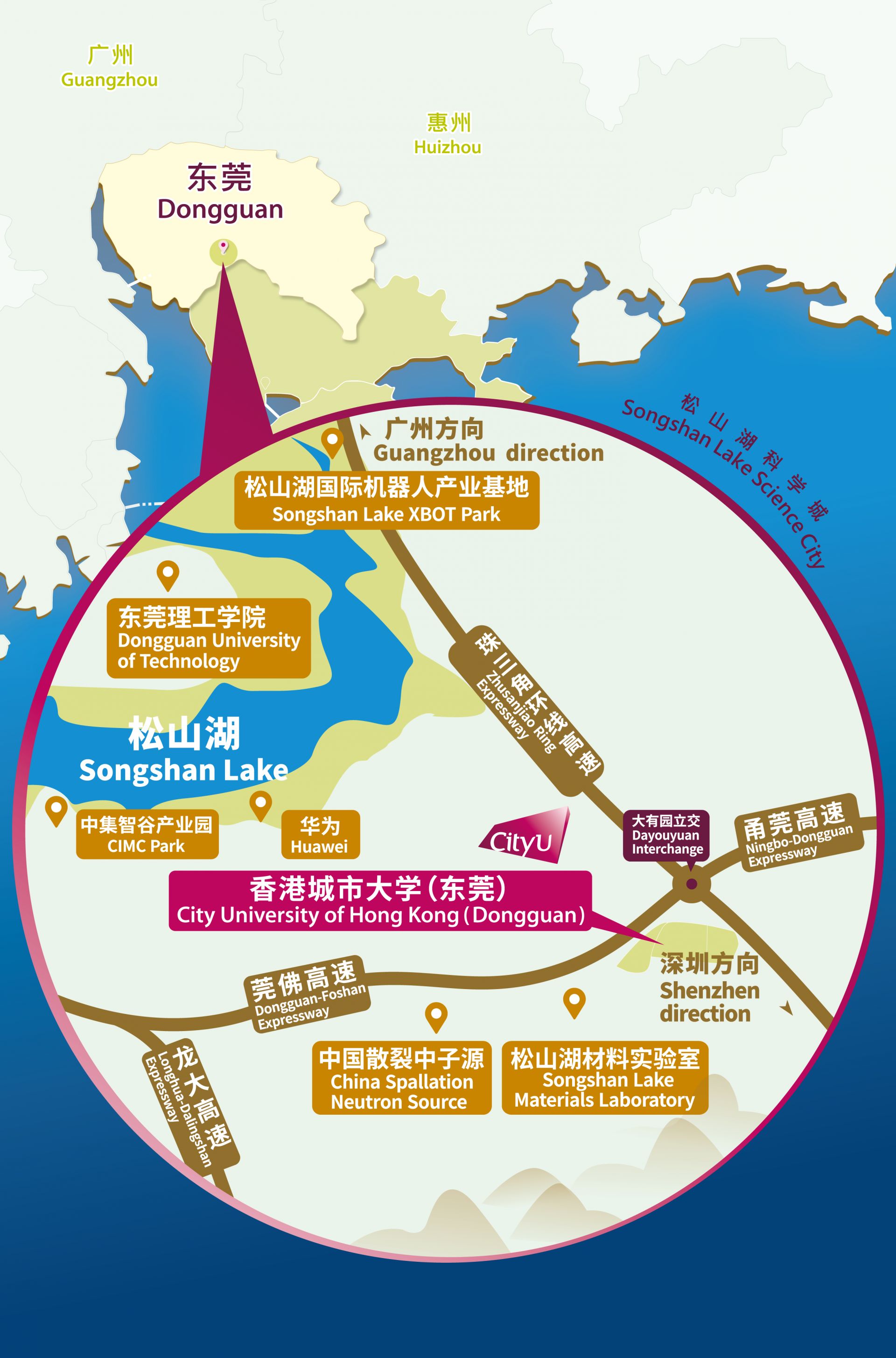 地理位置 地理位置 面包屑 首页 / 关于我们 校园 / 地理位置 地理位置 成立背景 愿景与使命 办学特色 治理 理事会 理事会成员 专业委员会 审计委员会 行政委员会 财务委员会 人力资源委员会 领导团队 建校历程 校园 地理位置 校园呈现 校园照片墙 设计理念 东莞探索 校园地图 联系我们 720°VR全景校园 大湾区中心腹地 港城大(东莞)坐落于东莞市松山湖科学城,南邻香港、深圳,北靠广州,该区域为粤港澳大湾区的黄金腹地,多路网筑多维立体交通。校园位于莞佛高速、甬莞高速、珠三角高速交汇处,紧靠松山湖出入口,毗邻华为、邻散裂中子源和松山湖材料实验室等智能终端和顶级科研院。平均一小时内能到达粤港澳大湾区内主要的机场、港口、高铁等交通基础设施以及广深港各科创中心。未来,这片热土将继续倚山临湖聚集更多创新资源,承载创新文化集群。 使用百度地图浏览港城大(东莞)