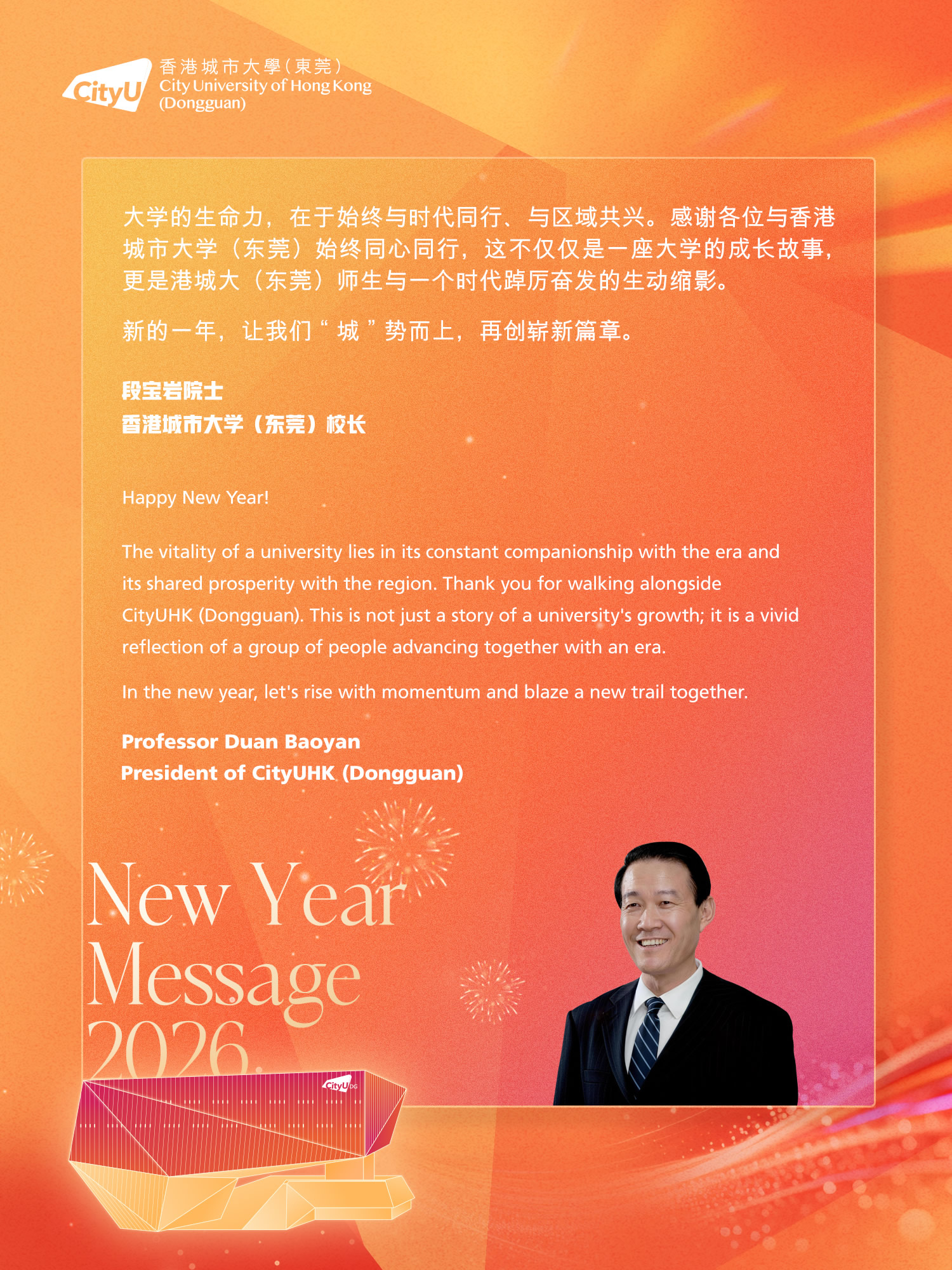 面包屑 首页 / 新闻资讯 / 校长新年贺词:“城”势而上,共筑国际化创新高地 校长新年贺词:“城”势而上,共筑国际化创新高地 2026-01-01 时序更替,万象更新。2026年的钟声已经敲响,我谨代表香港城市大学(东莞),向全校师生员工、所有关心支持学校发展的各界朋友,致以诚挚的问候和美好的祝福! 回望2025年,港城大(东莞)扎根粤港澳大湾区沃土,稳步前行。我们不仅传承香港城市大学的世界一流学术基因,更积极融入大湾区创新生态,着力构建国际化大学社区,培养融汇中外、知行合一的未来人才。 这一年,我们坚守“两校一质”,学术根基持续巩固。 港城大在国际舞台上屡创佳绩,成为香港第二所包揽四大全球大学排名百强的高校,连续两年被泰晤士高等教育评为“全球最国际化大学”,并有20个学科跻身QS世界百强。这些卓越的国际声誉,既是港城大实力的见证,也为港城大(东莞)高品质办学提供坚实底气。 这一年,我们深度融入湾区,创新链接日益紧密。 港城大(东莞)先后加入多个区域联盟,不仅积极融入大湾区国际科创中心建设,更与广东省科技厅、港城大开展深度科技合作,以“HK Tech 300”促进香港与内地的科创协同发展。立足松山湖科学城,我们和大科学装置、科研机构、领军企业携手并进,为区域创新发展注入港城大(东莞)智慧。 这一年,我们汇聚多元群体,国际化办学再上新台阶。 我们的国际化师资团队不断壮大,并持续吸纳优秀生源,首次迎来港澳台和国际本科生,真正形成了多元交融的大学社区。我们与剑桥大学等世界知名高校建立伙伴关系,开展十多个境外研学与交流项目,举办多场国际学术会议,为师生拓展全球视野厚植沃土。 这一年,我们丰富育人实践,培养体系更加完善。 港城大(东莞)获教育部批准多个本硕新专业,学科结构持续优化。我们坚持以学生为本,致力于培养兼具深厚学识、批判思维、社会担当与全球视野的未来高层次人才。我们欣喜地看到,学子们在国家级竞赛、企业实习与创业实践等活动中表现突出,展现出创新育人的扎实成效。 这一年,我们推进校园建设,办学条件不断优化。 校园设施进一步改善,国际化图书馆正式投入使用,各类新的空间陆续启用,为师生的学术研讨、文娱运动提供多种载体。我们与港城大的教授团队共建联合实验室,推动科研平台跨越发展。此外,教育基金会成立、二期工程启动,都为长远发展进一步夯实了基础。 这一年,我们拓展社会服务,校园文化与区域联动。 教授们围绕先进材料、计算机科学等领域与本地产业及社区深度合作,师生踊跃参与“十五全运会”、城市马拉松、华为开发者大会、科普进中学等志愿服务,体现高度的社会责任感。学校定期举办名家讲座、文化沙龙等活动,积极营造开放包容的学术交流平台。 展望2026年,我们将笃守教育初心,在人才培养、科学研究、社会服务等方面继续追求卓越。依托港城大的质量保障体系,我们将进一步构建“教研合一”的育人生态,汇聚全球优质师资,拓展合作网络,激励师生“创新无限”。 教育强国建设要求高水平教育对外开放,这也是我们这类新型研究型大学的历史使命。大学的生命力,在于始终与时代同行、与区域共兴。感谢各位与香港城市大学(东莞)始终同心同行,这不仅仅是一座大学的成长故事,更是港城大(东莞)师生与一个时代踔厉奋发的生动缩影。 新的一年,让我们“城”势而上,再创崭新篇章。 段宝岩院士 香港城市大学(东莞)校长 相关资讯 校长新年贺词:“城”势而上,共筑国际化创新高地 以真实场景提升创新能力:港城大(东莞)联合XbotPark举办黑客马拉松比赛 “龙汇100”青年代表团来访,教授谈高教绿色使命 港城大(东莞)教育基金会召开第一届理事会第二次会议 剑桥经验!英国杰出高等教育领袖到访港城莞