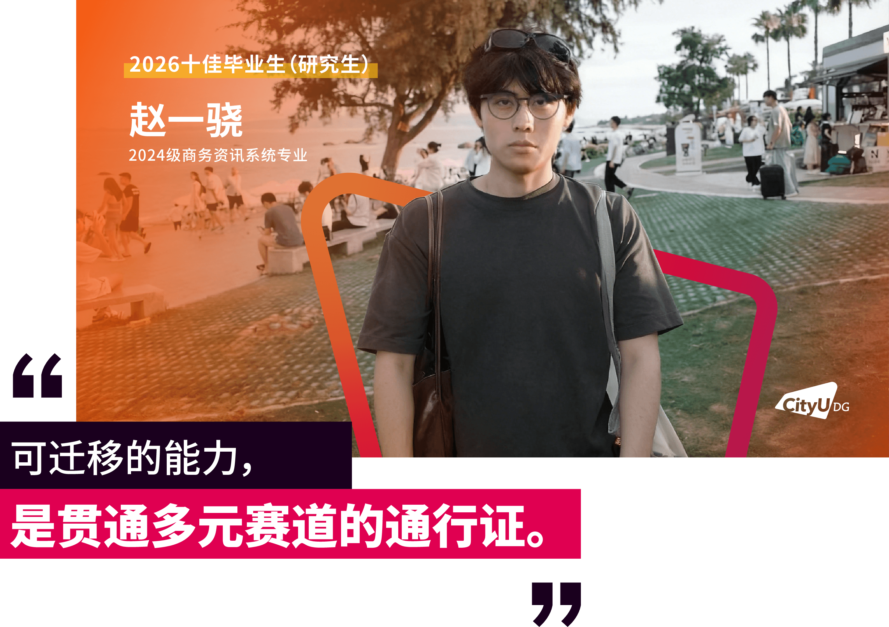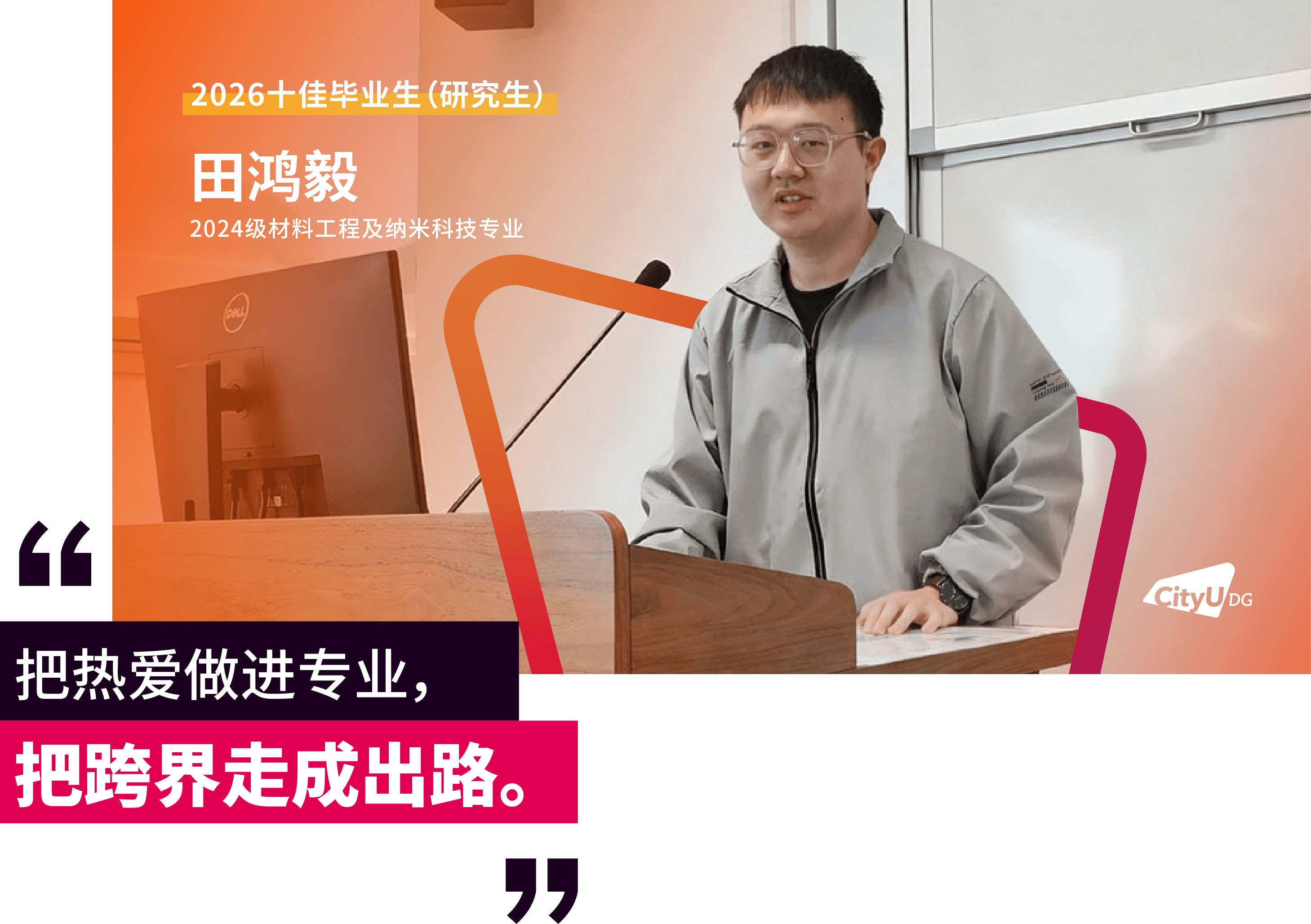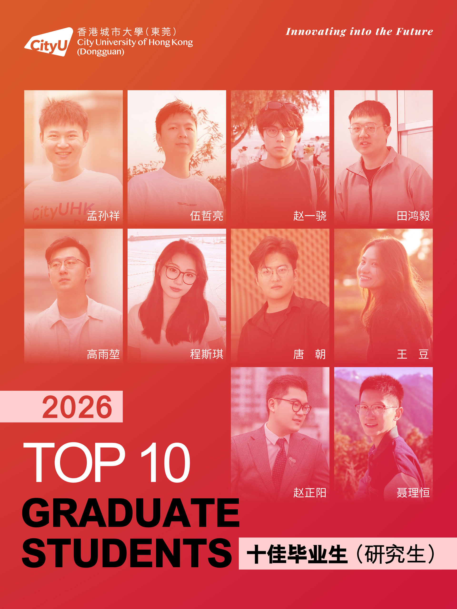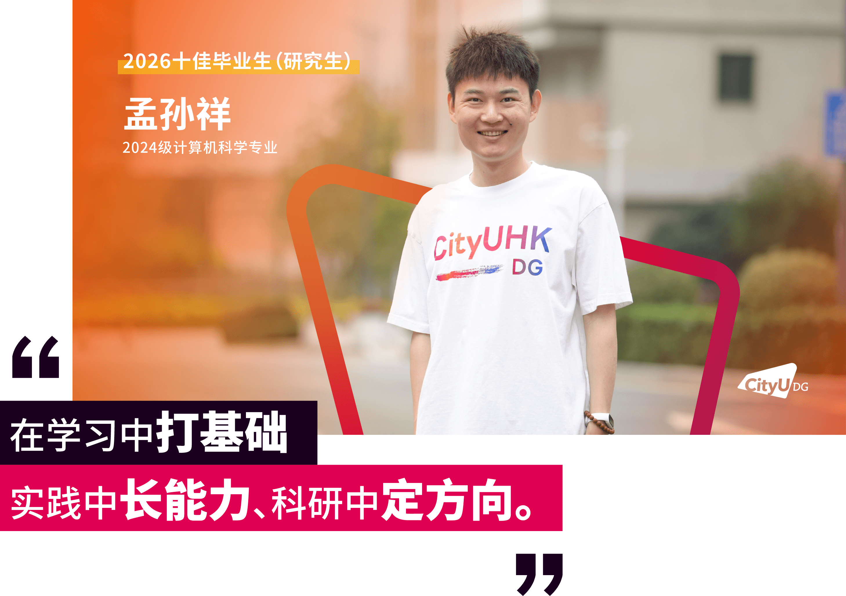 面包屑 首页 / 新闻资讯 / 香港城市大学(东莞)首届十佳研究生毕业生来了 香港城市大学(东莞)首届十佳研究生毕业生来了 2026-04-16 近日,经前期线上投票与现场评审,香港城市大学(东莞)2026年“十佳毕业生(研究生)”名单正式揭晓。这十张青春面孔用勇立潮头的姿态诠释了追求卓越的港城莞精神,他们是各自赛道上的探路者,更是港城大(东莞)“两校一质、教研合一、创新无限”办学理念的生动注脚。港城大(东莞)于2024年招收首届本科生和硕士研究生,今年即将迎来首届400多名硕士毕业生。据悉,目前不少硕士研究生获华为、腾讯、阿里巴巴、字节跳动、京东、宁德时代、OPPO、小米等大厂录用,或加入东莞、广州、深圳等地其他企事业单位,也有部分选择在世界名校读博深造。以下为首届“十佳毕业生(研究生)”的风采(以姓氏拼音排序):程斯琪(2024级商务资讯系统专业)“用知识一步步武装自己,用专业回馈社会,相信长期主义的力量。”获得一等奖学金,远不是程斯琪的全部,她以“知行合一”为信念,不局限于课堂,先向内“扎根”,再向外“跨越”。在腾讯实习期间,她将专业所学转化为具体能力,在真实业务中转变职场思维。正是这些步步“扎根”的经历,让她在秋招中斩获京东金融科技、中国平安等多家名企录用机会。把实践作为“必修课”的程斯琪相信长期主义的力量,从港城大(东莞)出发,在广阔的舞台上探寻实干者的无限可能,继而成为学校的骄傲。高雨堃(2024级数据科学专业)“好的大学,是让你有足够多的机会,去选择自己的未来。”在港城大(东莞),高雨堃始终将学术探索与躬身实践紧密融合。带着一等奖学金的荣誉,高雨堃开始了在港城大(东莞)的学习,并逐步找到了空间多组学细胞通讯推断的研究焦点,参与药物靶点预测等前沿课题。这些经历逐步锤炼出他独立的科研视野与学术韧性。最终,基于研究方向匹配度的考量,他选择留校继续深耕科研。实践中,他深度参与学校创新创业支持体系,协助构建竞赛生态,并担任数据科学专业学生助理,积累扎实的协同经验。被问及高校如何促进学生科研参与,高雨堃认为关键在于“用有趣的活动吸引参与,再用专业交流拉近距离”,从而帮助学生更直观地了解科研、做出选择。孟孙祥(2024级计算机科学专业)“在学习中打基础、实践中长能力、科研中定方向。”在港城大(东莞),孟孙祥始终坚持以学术积淀驱动技术创新,寻求算法效率与实际应用的最优解。绩点4.21/4.3,并获得学校一等奖学金——这是一份亮眼的成绩单。但这不是终点,而是他通往科研前沿的起点。他表示,在学校项目制的学习模式下,学生不应止步于书本知识,将思维束缚于考试解题中,还应切实去了解行业问题与前沿解决方法。在校期间,他作为科研助理参与港城大(东莞)与华为的合作项目,开展“多模态大模型Token压缩与加速”研究,聚焦让模型更轻、更快。毕业之际,他已获得香港城市大学全额奖学金,将继续攻读博士学位,在高效AI与具身智能领域深耕。聂理恒(2024级计算机科学专业)“于万千歧路中,终与真我久别重逢。”聂理恒称两年前初入港城大(东莞)的自己为“一块白板”,如今这块“白板”书写了属于他的精彩答卷与无限可能。除了收获知识,聂理恒认为港城大(东莞)更是以鼓励探索的环境,培养了他的韧性。他先后参与金融垂类智能体研究,在阿里巴巴和硅谷初创公司延展能力的边界。同时,他还在四川大学匹兹堡学院的机器人控制工程与自动化实验室的智能医疗机器人项目担任科研助理,在国家战略性新兴产业与现实需求的交汇处,寻找技术落地的更优路径。“于万千歧路中,终与真我久别重逢。”他用这句话总结过去的2年。目前,他已获得宁德时代、成都建工集团、中国邮政、阿里巴巴等多家企业录用机会。他用实际证明:所谓“歧路”,不过是未通的坦途。坚定前行,终能踏出自己的路。唐朝(2024级数据科学专业)“从一个人的‘点’,到一群人的‘面’,不仅因为热爱,更是因为传承。”对于唐朝而言,个人的热爱是“点”,朋辈的相互启发是“线”,“点”“线”的成果将不断地向外拓展为“面”。三者相互交织,这便是他理解的成长网络。始于对技术的热爱,他围绕算法与程序设计持续开展训练,取得了“华为杯”第二十一届中国研究生数学建模竞赛国家级一等奖和第50 届ICPC国际大学生程序设计竞赛亚洲区域赛(武汉)铜奖的成绩,更在与团队成员的交流与协作中,形成深刻联结。与此同时,他先后在宝洁、数字广东、快手等企业开展实习,并将自己的经验传递给学弟学妹们,形成影响持续的网络。目前,他已获得了快手大模型算法岗位和同花顺开发岗位的录用机会,在技术领域延续他的热爱。田鸿毅(2024级材料工程及纳米科技专业)“把热爱做进专业,把跨界走成出路。”田鸿毅是一位“探索者”,能够针对不同领域迅速切换视角。2024年,田鸿毅获得“华为杯”第二十一届中国研究生数学建模竞赛国家级一等奖。答辩现场被问及对竞赛参与的理解,他认为建模是对学术能力、生活经验与团队协作等多方面的综合考察。在这个过程中,“能力迁移”是关键。于科研,他以第一作者的身份发表多篇国际期刊论文,并合著出版课外数学建模专业书籍。他也将专业知识延伸至课堂之外,在创业过程中理解技术如何进入现实场景。最终,