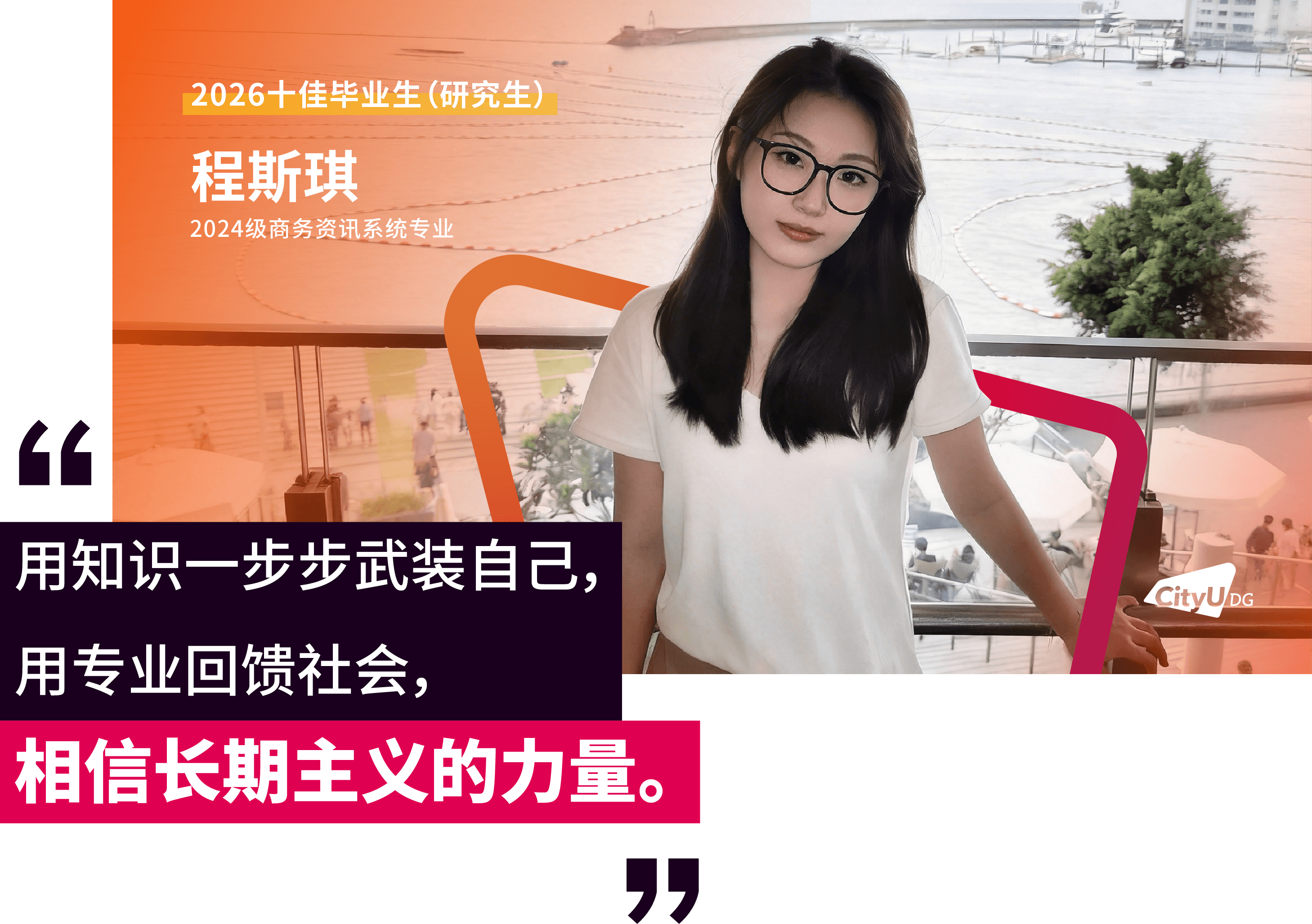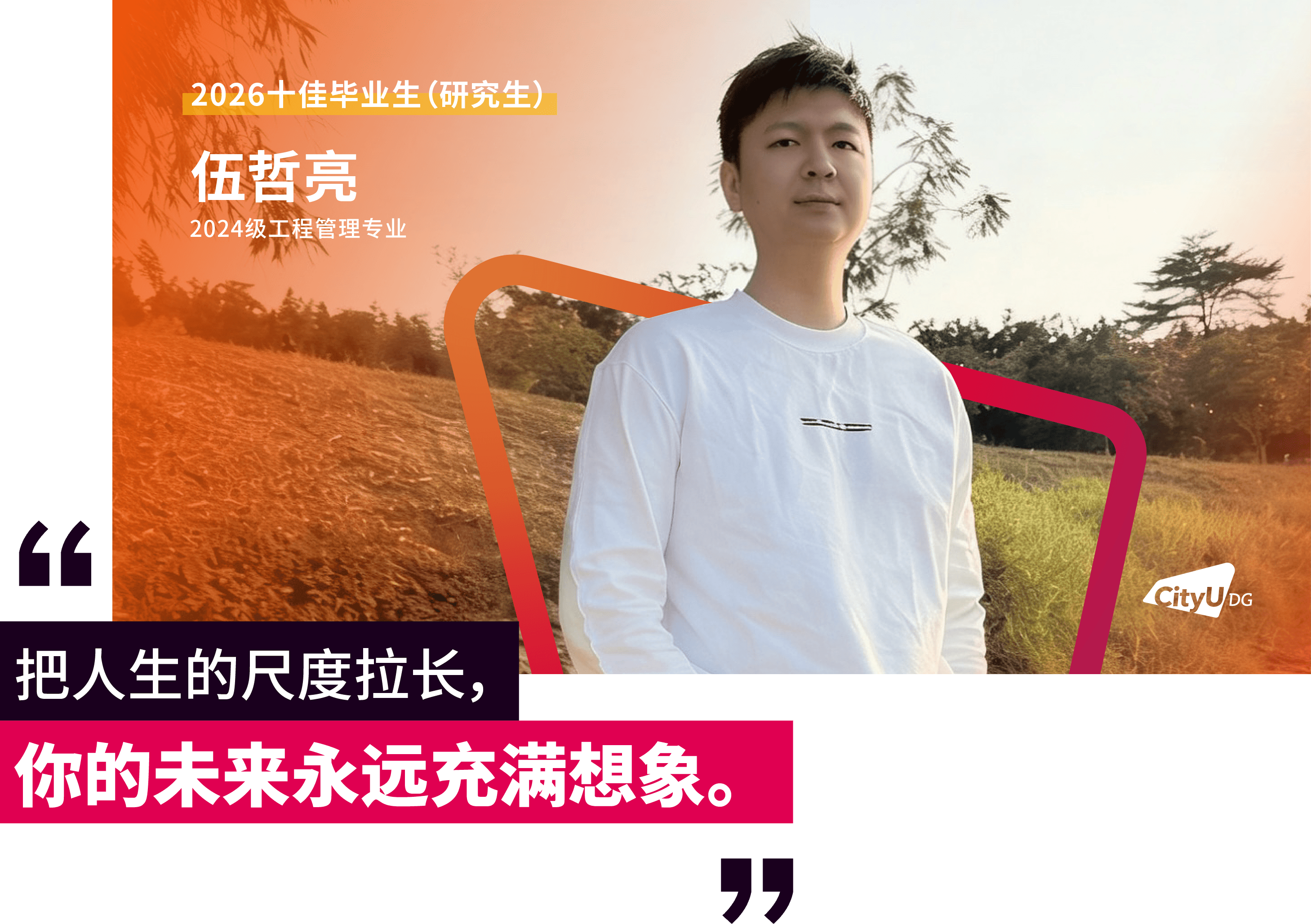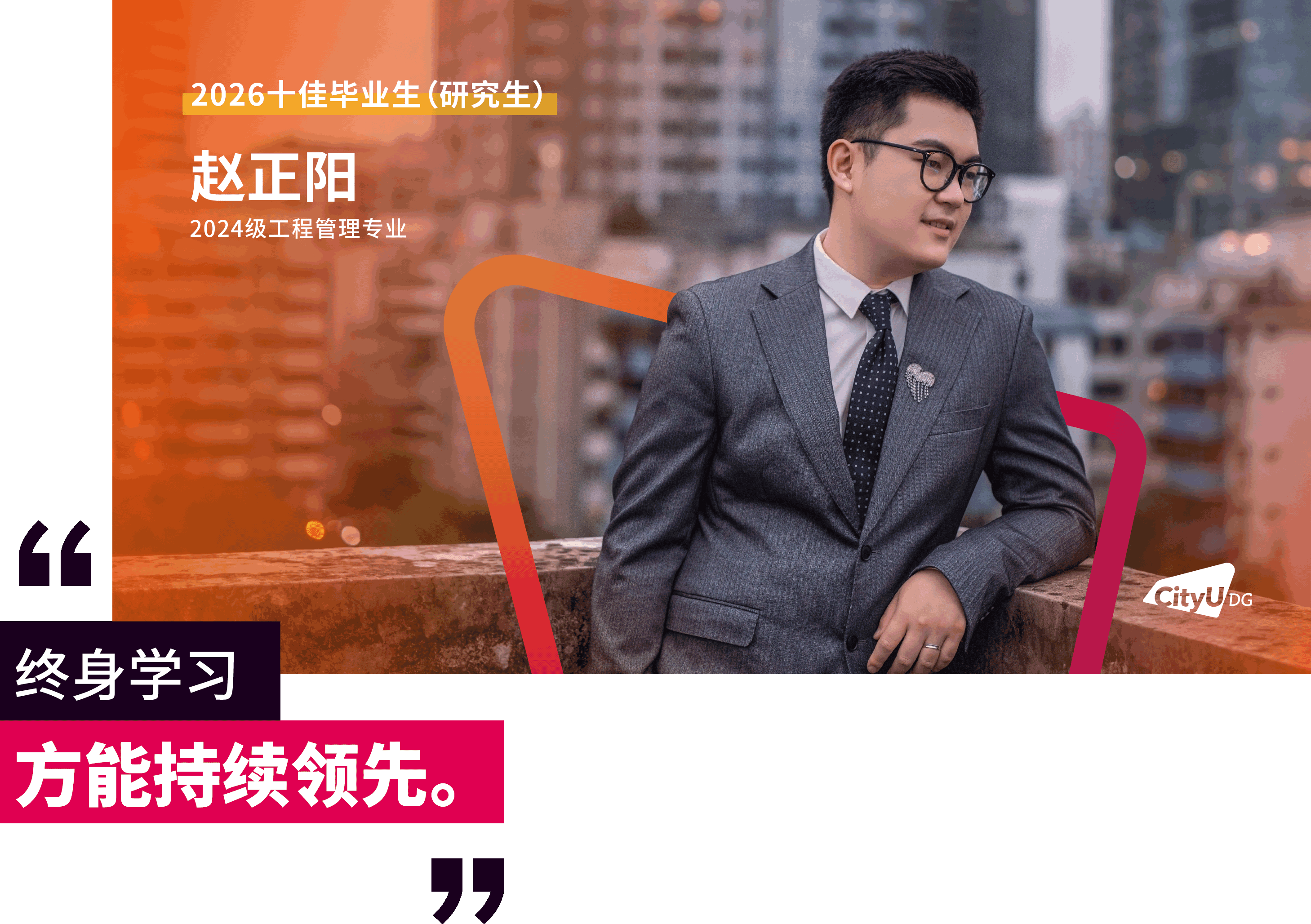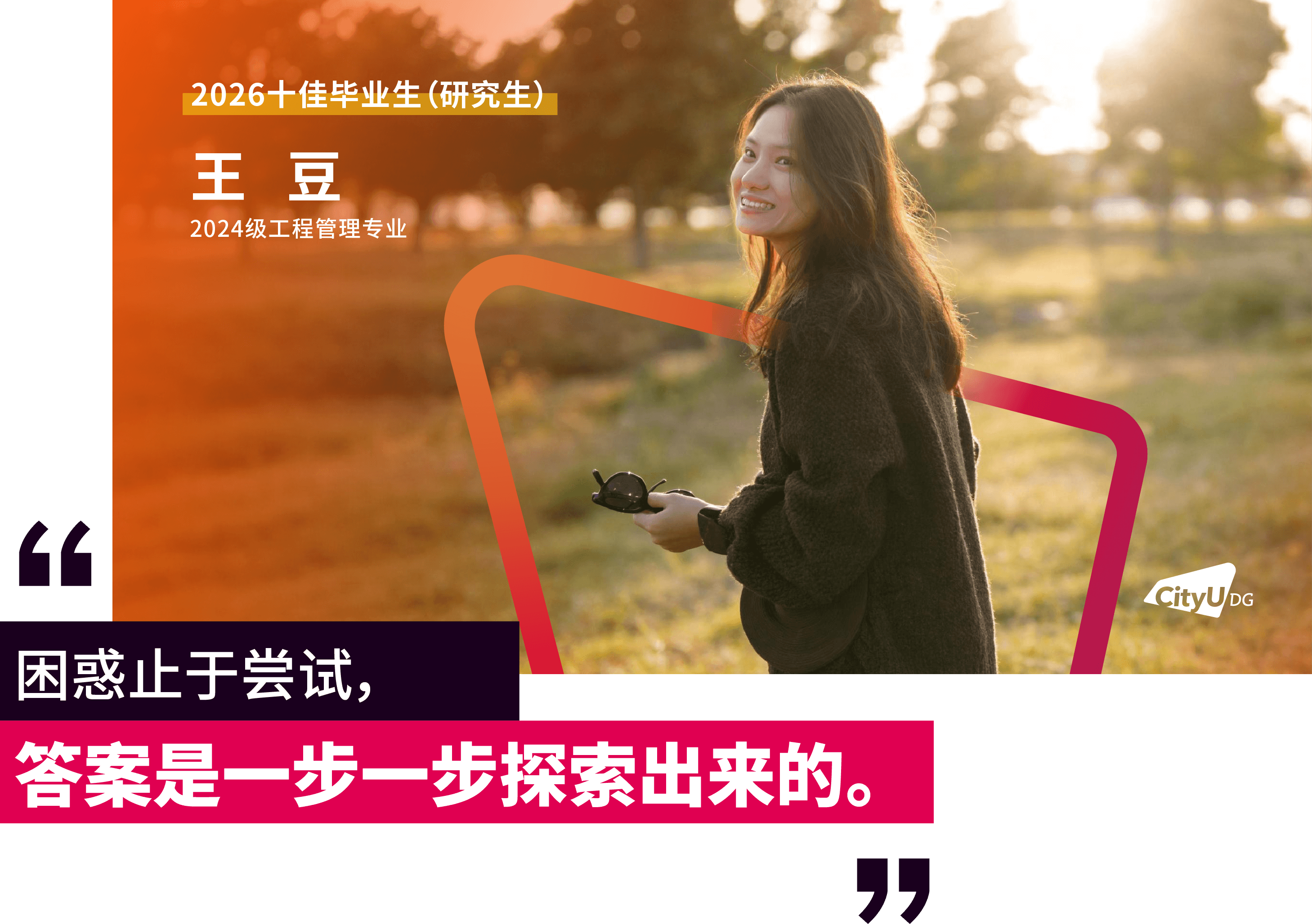 面包屑 首页 / 新闻资讯 / 香港城市大学(东莞)首届十佳研究生毕业生来了 香港城市大学(东莞)首届十佳研究生毕业生来了 2026-04-16 近日,经前期线上投票与现场评审,香港城市大学(东莞)2026年“十佳毕业生(研究生)”名单正式揭晓。这十张青春面孔用勇立潮头的姿态诠释了追求卓越的港城莞精神,他们是各自赛道上的探路者,更是港城大(东莞)“两校一质、教研合一、创新无限”办学理念的生动注脚。港城大(东莞)于2024年招收首届本科生和硕士研究生,今年即将迎来首届400多名硕士毕业生。据悉,目前不少硕士研究生获华为、腾讯、阿里巴巴、字节跳动、京东、宁德时代、OPPO、小米等大厂录用,或加入东莞、广州、深圳等地其他企事业单位,也有部分选择在世界名校读博深造。以下为首届“十佳毕业生(研究生)”的风采(以姓氏拼音排序):程斯琪(2024级商务资讯系统专业)“用知识一步步武装自己,用专业回馈社会,相信长期主义的力量。”获得一等奖学金,远不是程斯琪的全部,她以“知行合一”为信念,不局限于课堂,先向内“扎根”,再向外“跨越”。在腾讯实习期间,她将专业所学转化为具体能力,在真实业务中转变职场思维。正是这些步步“扎根”的经历,让她在秋招中斩获京东金融科技、中国平安等多家名企录用机会。把实践作为“必修课”的程斯琪相信长期主义的力量,从港城大(东莞)出发,在广阔的舞台上探寻实干者的无限可能,继而成为学校的骄傲。高雨堃(2024级数据科学专业)“好的大学,是让你有足够多的机会,去选择自己的未来。”在港城大(东莞),高雨堃始终将学术探索与躬身实践紧密融合。带着一等奖学金的荣誉,高雨堃开始了在港城大(东莞)的学习,并逐步找到了空间多组学细胞通讯推断的研究焦点,参与药物靶点预测等前沿课题。这些经历逐步锤炼出他独立的科研视野与学术韧性。最终,基于研究方向匹配度的考量,他选择留校继续深耕科研。实践中,他深度参与学校创新创业支持体系,协助构建竞赛生态,并担任数据科学专业学生助理,积累扎实的协同经验。被问及高校如何促进学生科研参与,高雨堃认为关键在于“用有趣的活动吸引参与,再用专业交流拉近距离”,从而帮助学生更直观地了解科研、做出选择。孟孙祥(2024级计算机科学专业)“在学习中打基础、实践中长能力、科研中定方向。”在港城大(东莞),孟孙祥始终坚持以学术积淀驱动技术创新,寻求算法效率与实际应用的最优解。绩点4.21/4.3,并获得学校一等奖学金——这是一份亮眼的成绩单。但这不是终点,而是他通往科研前沿的起点。他表示,在学校项目制的学习模式下,学生不应止步于书本知识,将思维束缚于考试解题中,还应切实去了解行业问题与前沿解决方法。在校期间,他作为科研助理参与港城大(东莞)与华为的合作项目,开展“多模态大模型Token压缩与加速”研究,聚焦让模型更轻、更快。毕业之际,他已获得香港城市大学全额奖学金,将继续攻读博士学位,在高效AI与具身智能领域深耕。聂理恒(2024级计算机科学专业)“于万千歧路中,终与真我久别重逢。”聂理恒称两年前初入港城大(东莞)的自己为“一块白板”,如今这块“白板”书写了属于他的精彩答卷与无限可能。除了收获知识,聂理恒认为港城大(东莞)更是以鼓励探索的环境,培养了他的韧性。他先后参与金融垂类智能体研究,在阿里巴巴和硅谷初创公司延展能力的边界。同时,他还在四川大学匹兹堡学院的机器人控制工程与自动化实验室的智能医疗机器人项目担任科研助理,在国家战略性新兴产业与现实需求的交汇处,寻找技术落地的更优路径。“于万千歧路中,终与真我久别重逢。”他用这句话总结过去的2年。目前,他已获得宁德时代、成都建工集团、中国邮政、阿里巴巴等多家企业录用机会。他用实际证明:所谓“歧路”,不过是未通的坦途。坚定前行,终能踏出自己的路。唐朝(2024级数据科学专业)“从一个人的‘点’,到一群人的‘面’,不仅因为热爱,更是因为传承。”对于唐朝而言,个人的热爱是“点”,朋辈的相互启发是“线”,“点”“线”的成果将不断地向外拓展为“面”。三者相互交织,这便是他理解的成长网络。始于对技术的热爱,他围绕算法与程序设计持续开展训练,取得了“华为杯”第二十一届中国研究生数学建模竞赛国家级一等奖和第50 届ICPC国际大学生程序设计竞赛亚洲区域赛(武汉)铜奖的成绩,更在与团队成员的交流与协作中,形成深刻联结。与此同时,他先后在宝洁、数字广东、快手等企业开展实习,并将自己的经验传递给学弟学妹们,形成影响持续的网络。目前,他已获得了快手大模型算法岗位和同花顺开发岗位的录用机会,在技术领域延续他的热爱。田鸿毅(2024级材料工程及纳米科技专业)“把热爱做进专业,把跨界走成出路。”田鸿毅是一位“探索者”,能够针对不同领域迅速切换视角。2024年,田鸿毅获得“华为杯”第二十一届中国研究生数学建模竞赛国家级一等奖。答辩现场被问及对竞赛参与的理解,他认为建模是对学术能力、生活经验与团队协作等多方面的综合考察。在这个过程中,“能力迁移”是关键。于科研,他以第一作者的身份发表多篇国际期刊论文,并合著出版课外数学建模专业书籍。他也将专业知识延伸至课堂之外,在创业过程中理解技术如何进入现实场景。最终,