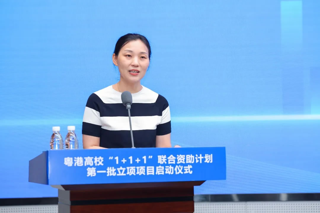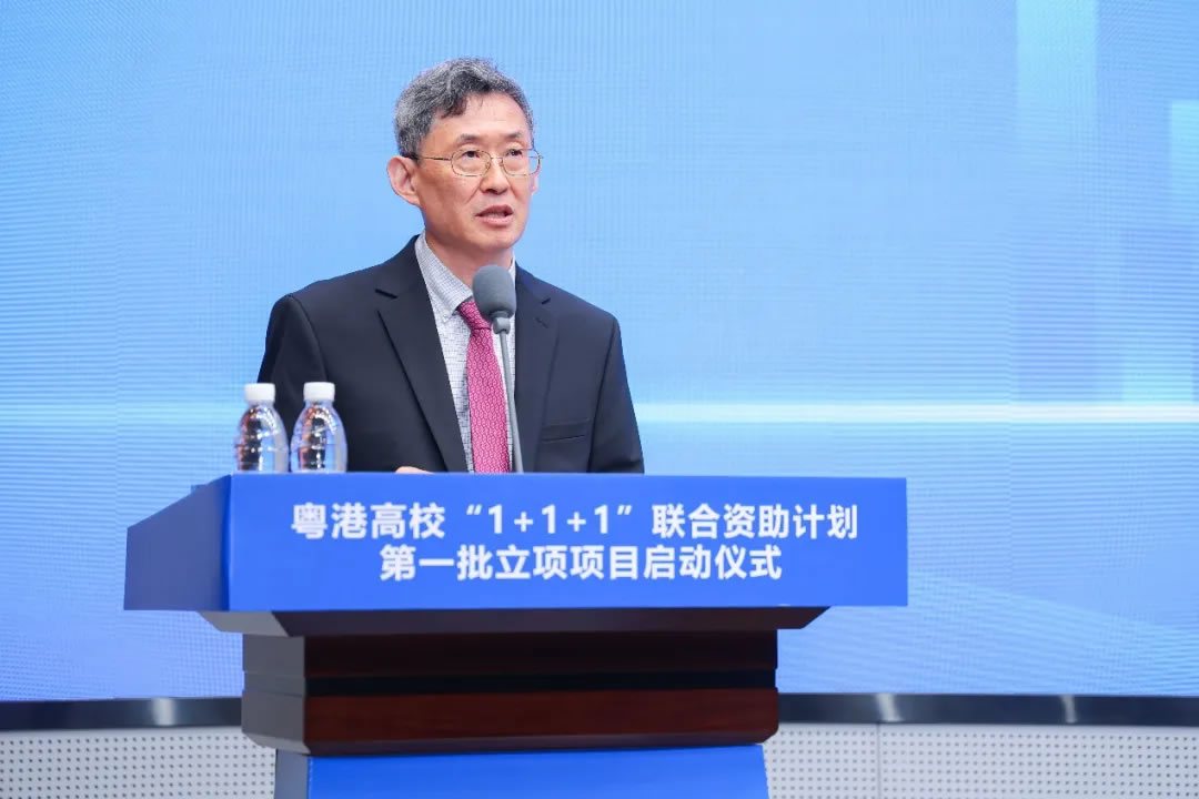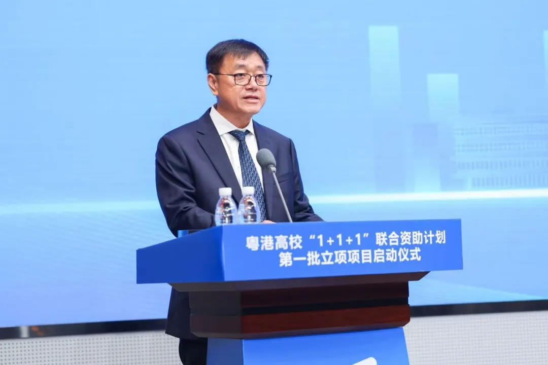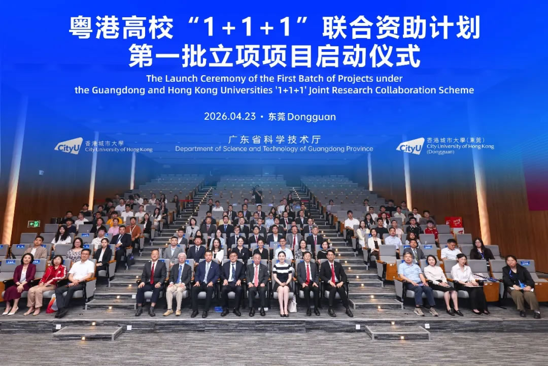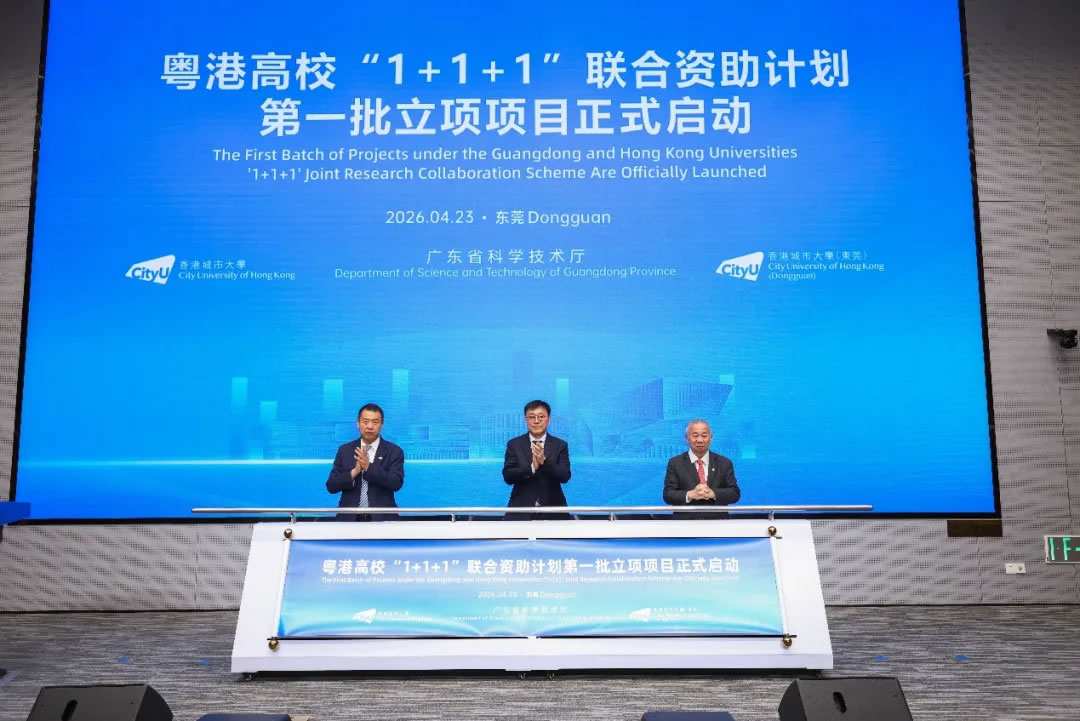 面包屑 首页 / 新闻资讯 / 粤港高校“1+1+1”联合资助计划首批项目正式启动 粤港高校“1+1+1”联合资助计划首批项目正式启动 2026-04-25 2026年4月23日,广东省科学技术厅、香港城市大学、香港城市大学(东莞)粤港高校“1+1+1”联合资助计划(以下简称“1+1+1”计划)第一批立项项目启动仪式在香港城市大学(东莞)举行,标志着三方合作已完成顶层设计与机制构建,正式进入全面实施阶段。广东省科学技术厅党组成员、副厅长李旭东,香港城市大学校长、香港城市大学(东莞)理事长梅彦昌教授,香港城市大学(东莞)执行校长、香港城市大学副校长鲁春教授代表三方共同宣布项目启动。东莞市科学技术局领导,以及两校师生代表参与见证,仪式由港城大(东莞)副校长刘子顺教授主持。此次“1+1+1”计划首批共立项15个项目,涵盖数码社会、智慧城市、新材料与新能源、智能制造等前沿交叉领域。该计划源于广东省科技厅、港城大、港城大(东莞)于2025年8月签署的《关于共同支持开展深度科技合作的工作计划》,通过三方联合资助形成种子资金池,重点支持两校联合开展契合大湾区发展需求的重大科研项目。李旭东副厅长指出,本次“1+1+1”计划的立项启动标志着粤港高校科技合作向深层次、高水平迈进,也是大湾区教育、科技、人才“三位一体”协同融合发展的生动实践,希望两校以此为契机,继续深化协作,聚焦湾区产业需求、瞄准前沿科技领域,推动协同创新提质增效,为建设国际科技创新中心、推动大湾区高质量发展贡献力量。梅彦昌教授在发言中分享了港城大践行的“三角合作模型”,即汇聚一流研究与国际合作、政府支持、粤港澳大湾区产业多方合力。他认为,“1+1+1”计划与“三角合作模型”相结合,将发挥“1+1+1>5”的效应,这样的创新生态在全球高校中独具优势。他进一步表示,粤港澳大湾区是充满活力的发展热土,勉励科研人员把握机遇,瞄准世界前沿开展研究,实现创新突破。东莞市科学技术局领导表示,东莞已构建“基础研究+技术攻关+成果转化+科技金融+人才支撑”的全过程创新生态链,将为科研提供基础支撑。东莞市科学技术局后续将强化政策支持,出台“1+5”科技创新政策并继续支持港城大(东莞)科技创新中心建设;深化产学研融合,引导首批立项项目精准对接东莞战略性新兴产业需求;拓展与港城大及港城大(东莞)的合作深度,共同探索粤港科技合作新路径。鲁春教授表示,港城大(东莞)扎根东莞、服务湾区、面向国家战略,致力于推动跨境科研协同、人才联合培养及产学研的深度融合。此次项目正式启动是三方同心协力、共谋创新的重要成果,为两地科研人员搭建了稳定高效的合作桥梁。港城大(东莞)将全力做好项目支持和资源保障,推动“1+1+1”计划取得实效,为大湾区的科技创新、为东莞的高质量发展贡献更大的力量。项目负责人代表、港城大任洋教授表示,资助立项不仅是一份荣誉,更是一份沉甸甸的责任。“1+1+1”计划为两校提供了一个打破地域壁垒、深度融合资源的宝贵平台。首批项目团队,都有一个共同的身份——粤港协同创新的践行者。他结合同港城大(东莞)李毅教授在非晶合金领域的合作研究实例,阐释“1+1+1”计划对两校基础科研攻坚、资源互通共享、人才联合培养的关键赋能作用。▲李旭东副厅长、梅彦昌教授、鲁春教授为入选项目代表颁发立项证书并合影留念。当日,与会嘉宾参观了港城大、港城大(东莞)“1+1+1”计划第一批立项项目展览。研究团队集中展示了获资助项目的研究定位、核心内容、协同攻关重点与成果产出规划,与会者就跨境合作机制与跨区域应用潜力等进行了充分研讨。▲港城大任洋教授现场介绍获批资助项目此次立项,充分体现两校科研资源与人才力量的深度协作。未来,各方将推动项目高效实施,力争产出更多高水平的创新成果,共同打造粤港高校科技合作标杆,为建设具有全球影响力的国际科技创新中心贡献更大力量。来源:科研管理处、媒体传讯处 相关资讯 AI成为设计“标配”?港城莞这场大赛说:人是核心 持续上升!港城大跃居THE亚洲大学排名15强 粤港高校“1+1+1”联合资助计划首批项目正式启动 跨境科研协同:港城大与港城大(东莞)共享实验室揭幕 香港城市大学(东莞)首届十佳研究生毕业生来了