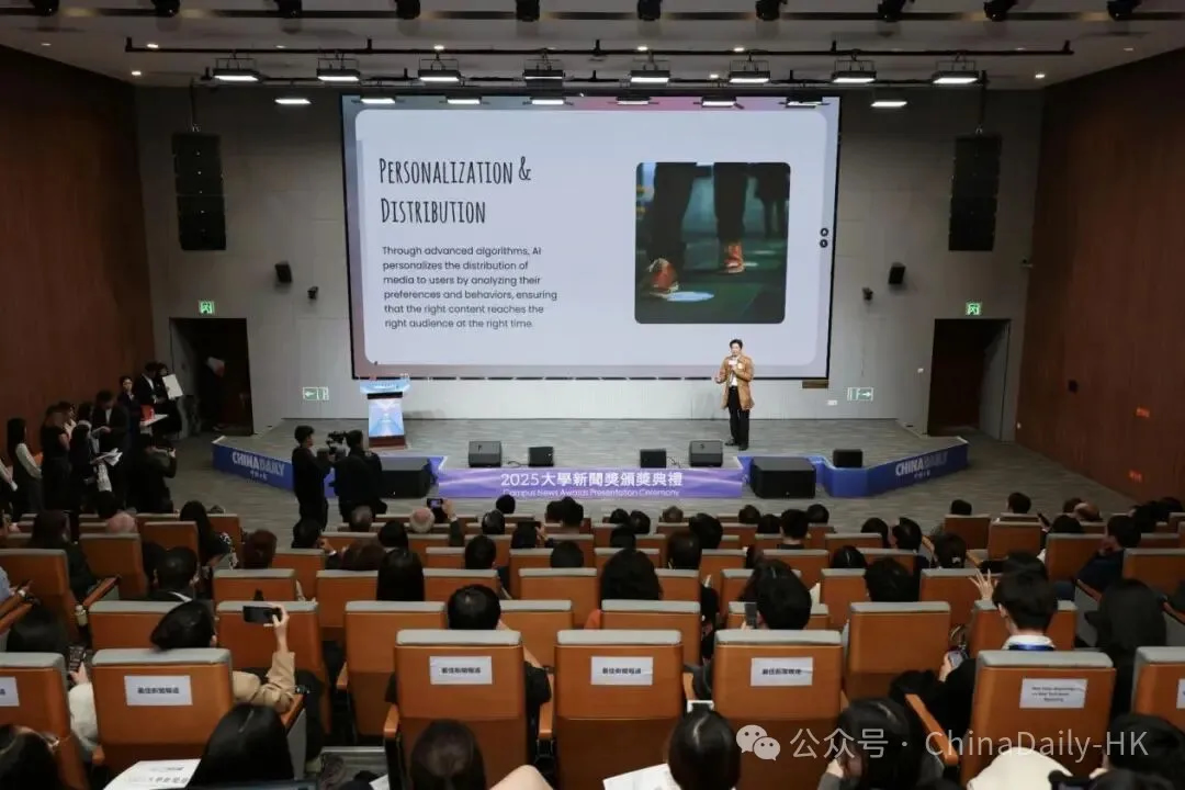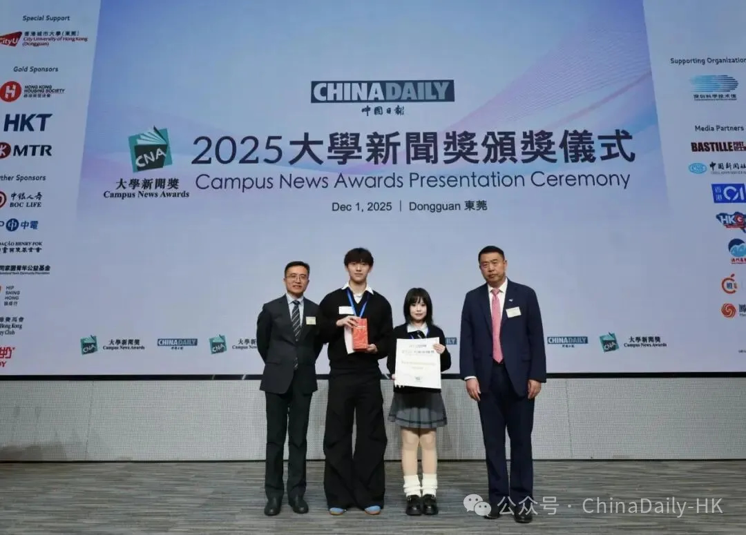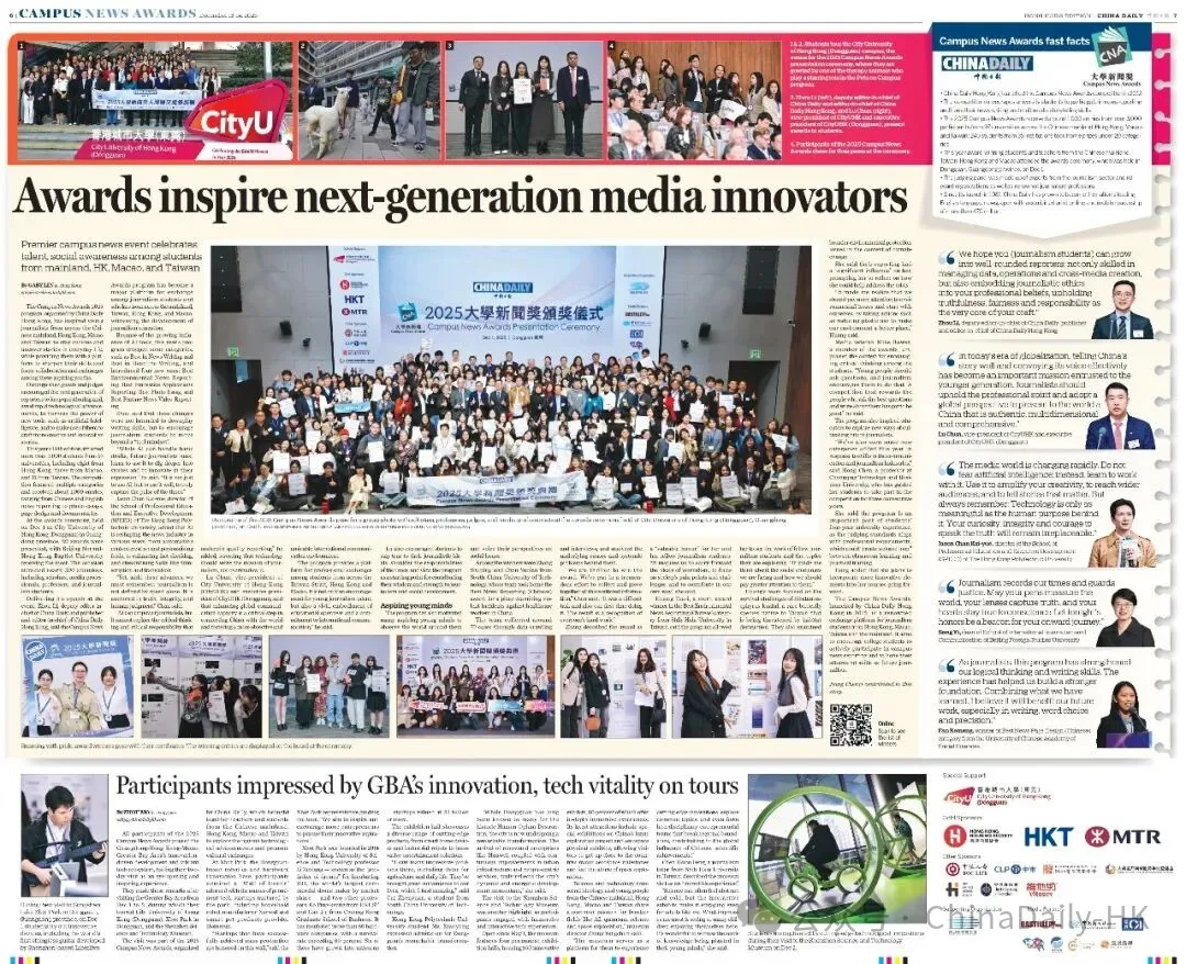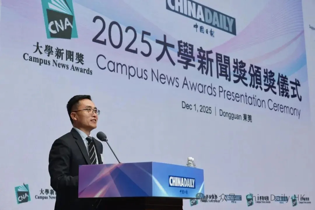 面包屑 首页 / 新闻资讯 / 中国日报2025年大学新闻奖颁奖仪式在香港城市大学(东莞)举行 中国日报2025年大学新闻奖颁奖仪式在香港城市大学(东莞)举行 2025-12-13 由中国日报举办的2025年大学新闻奖颁奖仪式于12月1日在香港城市大学(东莞)举行,香港城市大学(东莞)执行校长鲁春教授、中国日报社副总编辑兼香港版总编辑周立致辞。今年,大学新闻奖组委会还于颁奖仪式前后组织师生参访团,前往东莞松山湖XbotPark机器人基地、深圳科学技术馆参访交流,以大湾区为窗口,让海峡两岸暨港澳地区的青年学子亲身感受祖国科技发展活力,深度体验前沿成果。颁奖仪式主要嘉宾合影广东省东莞市台港澳事务局副局长欧阳全,澳门特别行政区政府新闻局研究及推广厅代厅长马俊业,广东省东莞市委宣传部副部长、市人民政府新闻办公室主任何碧怡,东莞市教育局三级调研员高万军等嘉宾,以及获奖师生、业界专家、媒体代表等近300人出席本次颁奖仪式。香港理工大学专业进修学院院长陈继宇博士发表中场演讲。仪式在正式开始前组织全体嘉宾起立,为11月26日香港大埔火灾的遇难者默哀一分钟,对逝者致以沉痛的哀悼。香港城市大学(东莞)执行校长鲁春致辞鲁春表示,提升国际传播能力是连接中国与世界,构建更客观、友善的国际舆论环境的关键一环。在全球化的今天,讲好中国故事,传播好中国声音已成为时代赋予青年一代的重要使命。新闻工作者当以专业精神与国际视野向世界展现真实、立体、全面的中国。希望同学们以此次获奖为起点,坚守新闻初心,勇担时代责任,为新闻传播事业与社会发展贡献智慧与力量。中国日报社副总编辑兼香港版总编辑周立致辞周立鼓励新闻学子跳出工具思维,当AI能完成基础表达,未来的新闻人应学会用AI深挖故事、创新表达,从“会用AI”到“用好AI”,真正把握时代的脉搏。今天的媒体环境早已不再是纸和笔的时代,我们期待同学们成为复合型的新闻人才,懂数据、善运营、会跨媒体创作,更要把新闻伦理刻进职业信仰,真实、公正、有担当,这才是专业能力的“根”与“魂”。香港理工大学专业进修学院院长陈继宇发表中场演讲陈继宇在中场演讲中分享了AI对新闻创作的影响与启示。他指出,人工智能正通过自动化内容生产、个性化资讯推送、强化事实核查、简化转录翻译等方面重塑新闻业态。然而,人工智能可以赋能记者,但无法替代支撑优质报道的批判性思维与职业操守,技术应当服务于新闻使命。因此,新闻教育应当以培养能够统筹创意与技术的下一代传媒人才为使命。嘉宾为学生颁奖今年是大学新闻奖举办的第十四年,本届组委会新设最佳环保新闻报道(中英文)、最佳图片故事、最佳创意应用报道及最佳新闻专题视频五个奖项,鼓励学生结合融媒体进行创新,在彰显新闻学特色的同时丰富大学生课余生活,吸引了近百所来自海峡两岸暨港澳地区大学的逾三千名学子参与。其中包括香港8所大学,澳门3所大学与台湾12所大学,涵盖香港中文大学、澳门大学、世新大学、北京大学和清华大学等知名高校。本次大学新闻奖共颁发中英文组别奖项及最踊跃参与奖等共20个奖项,共35间学校参赛作品入围,入围学生245人,北师香港浸会大学斩获最多奖项。学生合影留念本届大学新闻奖评委们对获奖学子们送上寄语。北京外国语大学国际新闻与传播学院院长宋毅表示,新闻是时代的记录者,也是正义的守望者,愿同学们用笔触丈量世界,用镜头捕捉真相,用初心守护良知。义守大学大众传播学系副教授林崇能对获奖同学表示祝贺,同时指出本次参赛作品水平不分轩轾,落选作品也同样优秀,希望同学们未来可以在各地发光发热。澳门大学人文学院院长徐杰对参赛作品的专业水平和时代气息表示赞赏,祝贺所有参与者并勉励大家享受过程、收获成长。前香港投资推广署署长卢维思(Mike Rowse)表示,大学新闻奖的评委工作使他了解到当下中国年轻人的思想、愿景及兴趣所在,能够与时俱进。学生合影留念海峡两岸暨港澳地区参赛学生代表也分享了获奖感受。中国社会科学院大学的范珂萌发表获奖感言,感谢大学新闻奖提供宝贵的参赛机会以及评委们对作品的认可,祝愿所有参赛同学不虚此行,找到属于自己的人生答案。台湾世新大学的黄子宜表示,此次获得“最佳新闻环境报道奖”优异奖极大地激励了她作为新闻人的社会责任感,大学新闻奖不仅是一场比赛,更是一个激发专业思考、培育青年新闻人使命感的关键舞台。澳门大学的王小丫表示,本次获奖坚定了自己从事摄影行业的信心,未来会继续发展相关能力。华南理工大学团队表示,对新闻学子而言,获得大学新闻奖是一项含金量很高的荣誉,本次获奖是对所有人能力与努力的认可,将激励同学们继续追求新闻理想。重庆工商学院教授红尘本次带领学生团队取得良好成绩,她表示,大学新闻奖极大地提升了新闻传播教育的质量,让新闻专业教育的教学与参赛形成了完整的实践闭环。大湾区参访活动今年是大学新闻奖第四次走进广东省大湾区城市组织师生参访活动,旨在促进海峡两岸暨港澳地区青年学子亲身感受内地的发展活力与多元文化,加深交流交往,增强国家与民族认同感。松山湖XbotPark机器人基地师生在松山湖XbotPark机器人基地参观体验多种科技产品颁奖仪式前,大学新闻奖组织师生前往