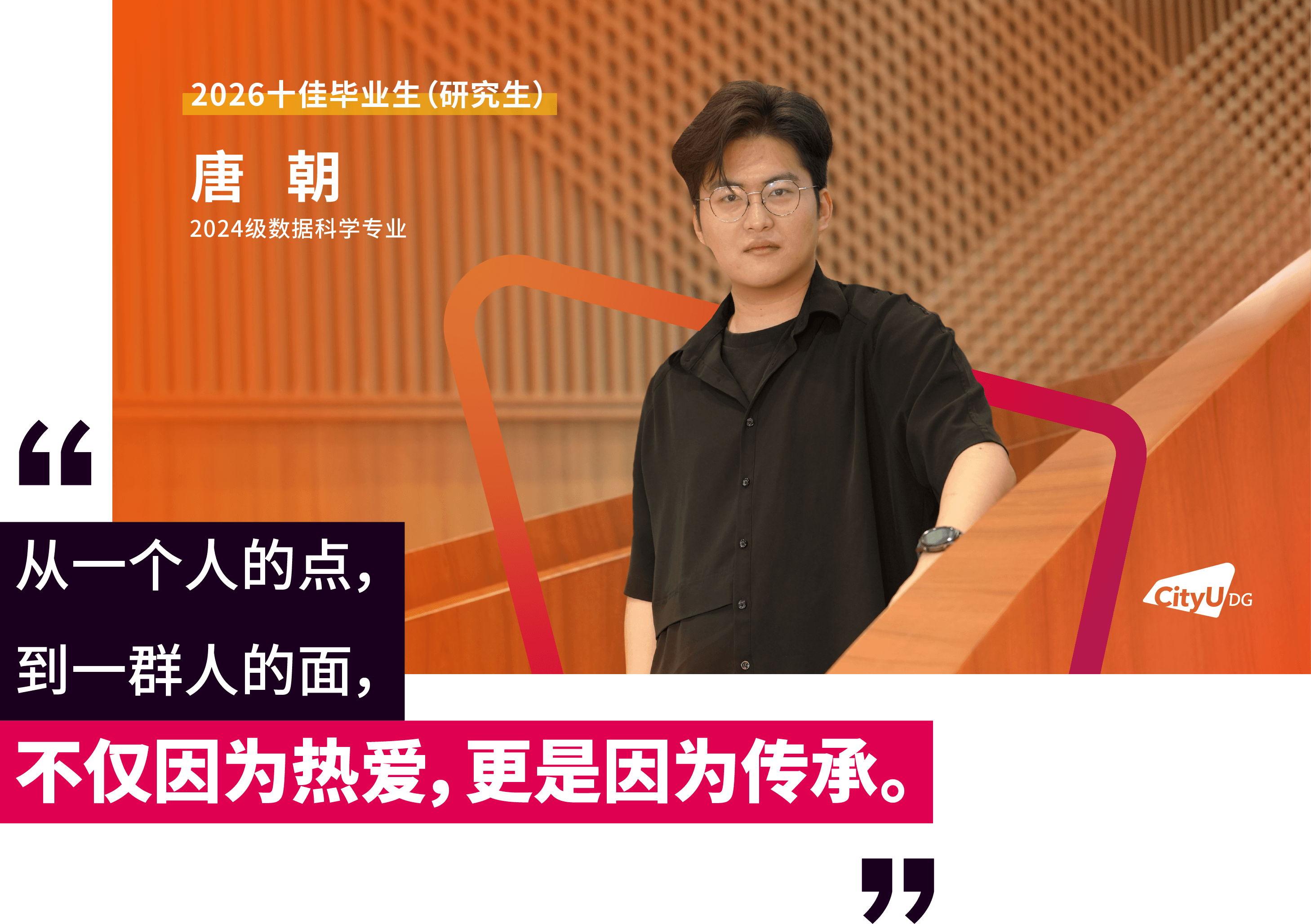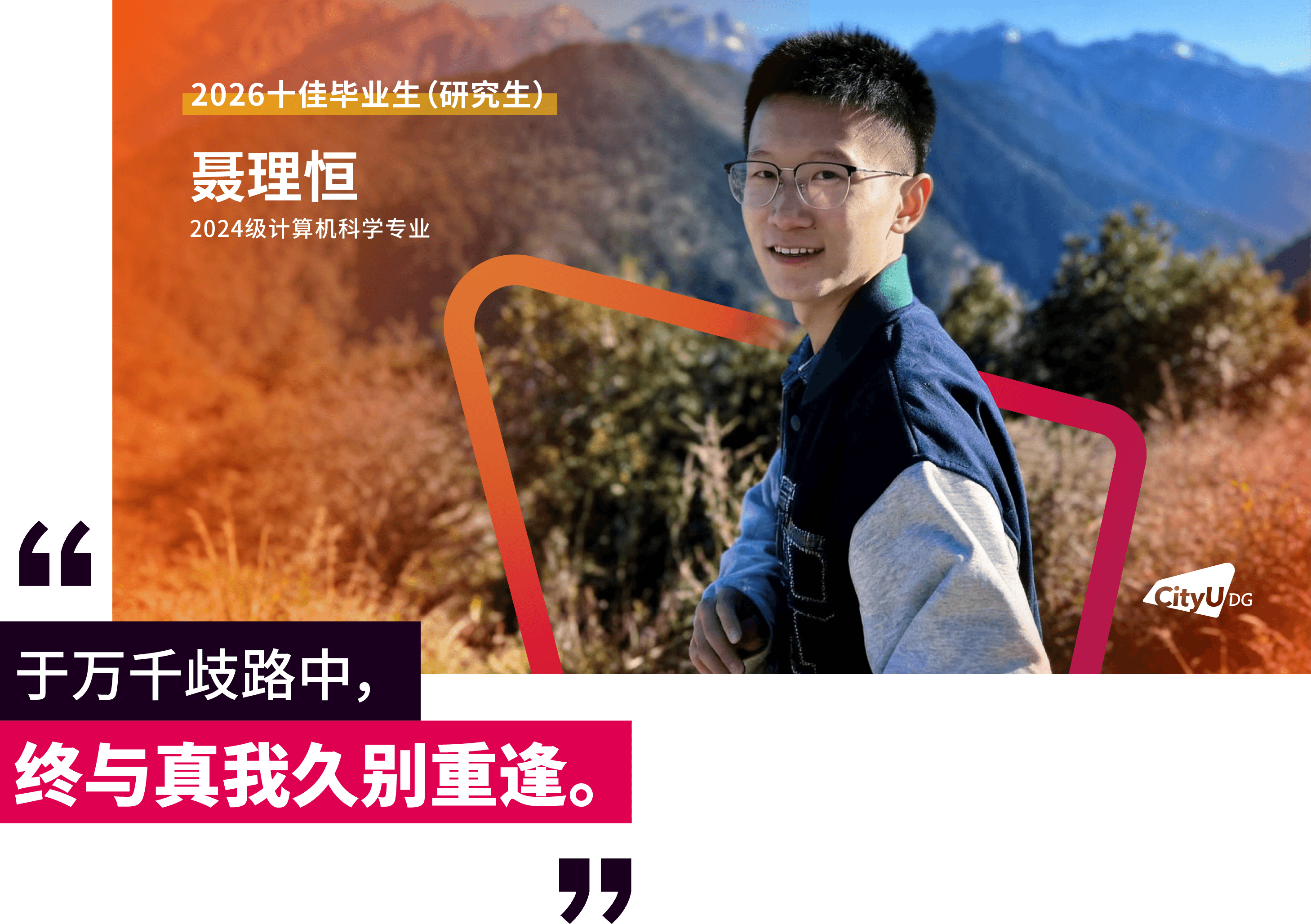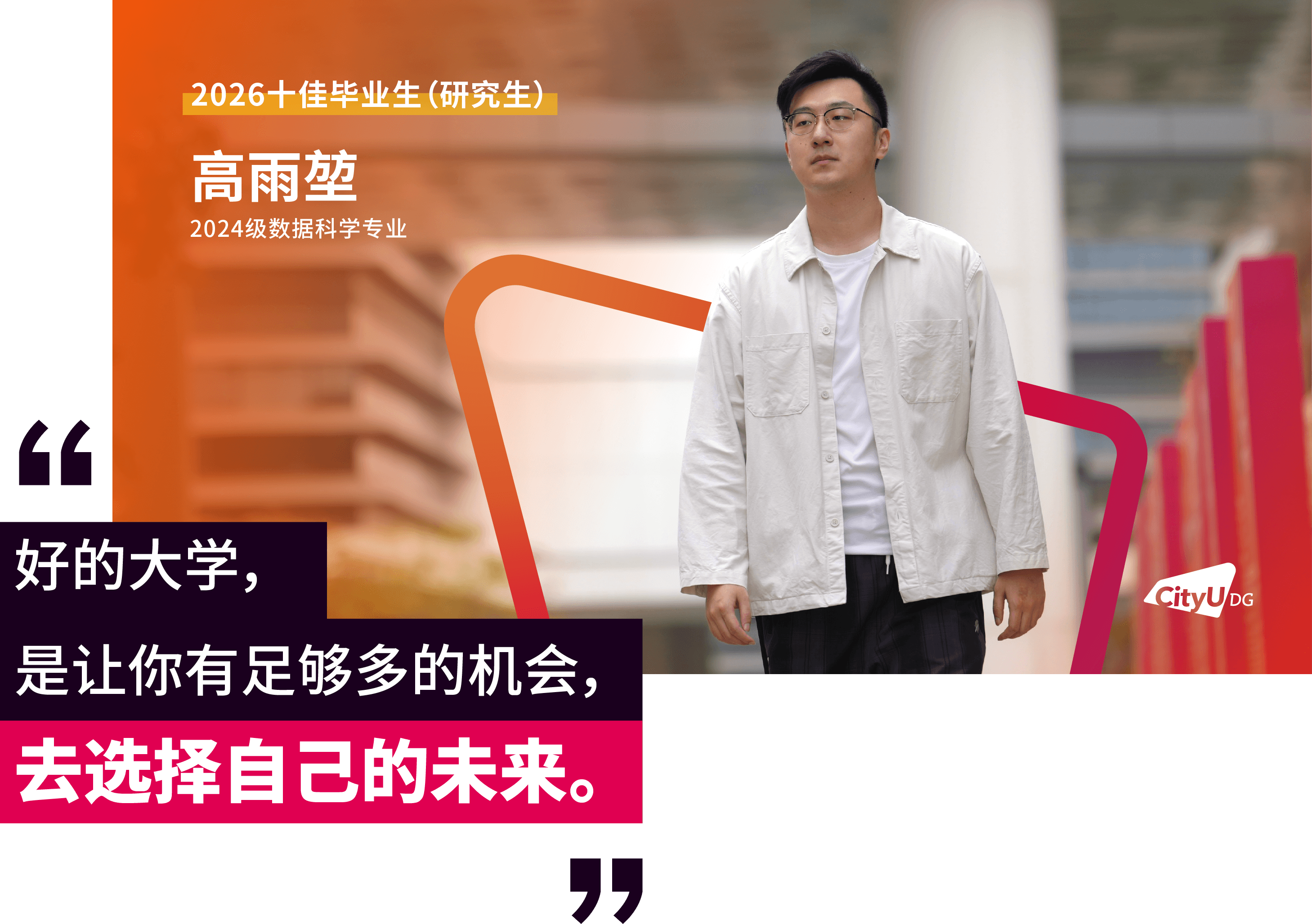 面包屑 首页 / 新闻资讯 / 香港城市大学(东莞)首届十佳研究生毕业生来了 香港城市大学(东莞)首届十佳研究生毕业生来了 2026-04-16 近日,经前期线上投票与现场评审,香港城市大学(东莞)2026年“十佳毕业生(研究生)”名单正式揭晓。这十张青春面孔用勇立潮头的姿态诠释了追求卓越的港城莞精神,他们是各自赛道上的探路者,更是港城大(东莞)“两校一质、教研合一、创新无限”办学理念的生动注脚。港城大(东莞)于2024年招收首届本科生和硕士研究生,今年即将迎来首届400多名硕士毕业生。据悉,目前不少硕士研究生获华为、腾讯、阿里巴巴、字节跳动、京东、宁德时代、OPPO、小米等大厂录用,或加入东莞、广州、深圳等地其他企事业单位,也有部分选择在世界名校读博深造。以下为首届“十佳毕业生(研究生)”的风采(以姓氏拼音排序):程斯琪(2024级商务资讯系统专业)“用知识一步步武装自己,用专业回馈社会,相信长期主义的力量。”获得一等奖学金,远不是程斯琪的全部,她以“知行合一”为信念,不局限于课堂,先向内“扎根”,再向外“跨越”。在腾讯实习期间,她将专业所学转化为具体能力,在真实业务中转变职场思维。正是这些步步“扎根”的经历,让她在秋招中斩获京东金融科技、中国平安等多家名企录用机会。把实践作为“必修课”的程斯琪相信长期主义的力量,从港城大(东莞)出发,在广阔的舞台上探寻实干者的无限可能,继而成为学校的骄傲。高雨堃(2024级数据科学专业)“好的大学,是让你有足够多的机会,去选择自己的未来。”在港城大(东莞),高雨堃始终将学术探索与躬身实践紧密融合。带着一等奖学金的荣誉,高雨堃开始了在港城大(东莞)的学习,并逐步找到了空间多组学细胞通讯推断的研究焦点,参与药物靶点预测等前沿课题。这些经历逐步锤炼出他独立的科研视野与学术韧性。最终,基于研究方向匹配度的考量,他选择留校继续深耕科研。实践中,他深度参与学校创新创业支持体系,协助构建竞赛生态,并担任数据科学专业学生助理,积累扎实的协同经验。被问及高校如何促进学生科研参与,高雨堃认为关键在于“用有趣的活动吸引参与,再用专业交流拉近距离”,从而帮助学生更直观地了解科研、做出选择。孟孙祥(2024级计算机科学专业)“在学习中打基础、实践中长能力、科研中定方向。”在港城大(东莞),孟孙祥始终坚持以学术积淀驱动技术创新,寻求算法效率与实际应用的最优解。绩点4.21/4.3,并获得学校一等奖学金——这是一份亮眼的成绩单。但这不是终点,而是他通往科研前沿的起点。他表示,在学校项目制的学习模式下,学生不应止步于书本知识,将思维束缚于考试解题中,还应切实去了解行业问题与前沿解决方法。在校期间,他作为科研助理参与港城大(东莞)与华为的合作项目,开展“多模态大模型Token压缩与加速”研究,聚焦让模型更轻、更快。毕业之际,他已获得香港城市大学全额奖学金,将继续攻读博士学位,在高效AI与具身智能领域深耕。聂理恒(2024级计算机科学专业)“于万千歧路中,终与真我久别重逢。”聂理恒称两年前初入港城大(东莞)的自己为“一块白板”,如今这块“白板”书写了属于他的精彩答卷与无限可能。除了收获知识,聂理恒认为港城大(东莞)更是以鼓励探索的环境,培养了他的韧性。他先后参与金融垂类智能体研究,在阿里巴巴和硅谷初创公司延展能力的边界。同时,他还在四川大学匹兹堡学院的机器人控制工程与自动化实验室的智能医疗机器人项目担任科研助理,在国家战略性新兴产业与现实需求的交汇处,寻找技术落地的更优路径。“于万千歧路中,终与真我久别重逢。”他用这句话总结过去的2年。目前,他已获得宁德时代、成都建工集团、中国邮政、阿里巴巴等多家企业录用机会。他用实际证明:所谓“歧路”,不过是未通的坦途。坚定前行,终能踏出自己的路。唐朝(2024级数据科学专业)“从一个人的‘点’,到一群人的‘面’,不仅因为热爱,更是因为传承。”对于唐朝而言,个人的热爱是“点”,朋辈的相互启发是“线”,“点”“线”的成果将不断地向外拓展为“面”。三者相互交织,这便是他理解的成长网络。始于对技术的热爱,他围绕算法与程序设计持续开展训练,取得了“华为杯”第二十一届中国研究生数学建模竞赛国家级一等奖和第50 届ICPC国际大学生程序设计竞赛亚洲区域赛(武汉)铜奖的成绩,更在与团队成员的交流与协作中,形成深刻联结。与此同时,他先后在宝洁、数字广东、快手等企业开展实习,并将自己的经验传递给学弟学妹们,形成影响持续的网络。目前,他已获得了快手大模型算法岗位和同花顺开发岗位的录用机会,在技术领域延续他的热爱。田鸿毅(2024级材料工程及纳米科技专业)“把热爱做进专业,把跨界走成出路。”田鸿毅是一位“探索者”,能够针对不同领域迅速切换视角。2024年,田鸿毅获得“华为杯”第二十一届中国研究生数学建模竞赛国家级一等奖。答辩现场被问及对竞赛参与的理解,他认为建模是对学术能力、生活经验与团队协作等多方面的综合考察。在这个过程中,“能力迁移”是关键。于科研,他以第一作者的身份发表多篇国际期刊论文,并合著出版课外数学建模专业书籍。他也将专业知识延伸至课堂之外,在创业过程中理解技术如何进入现实场景。最终,